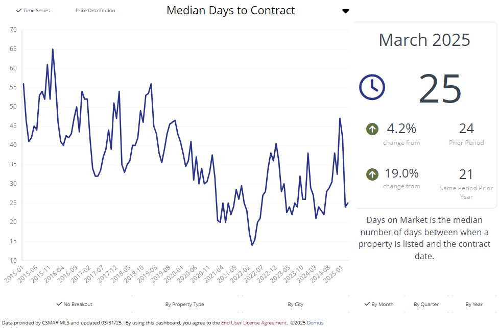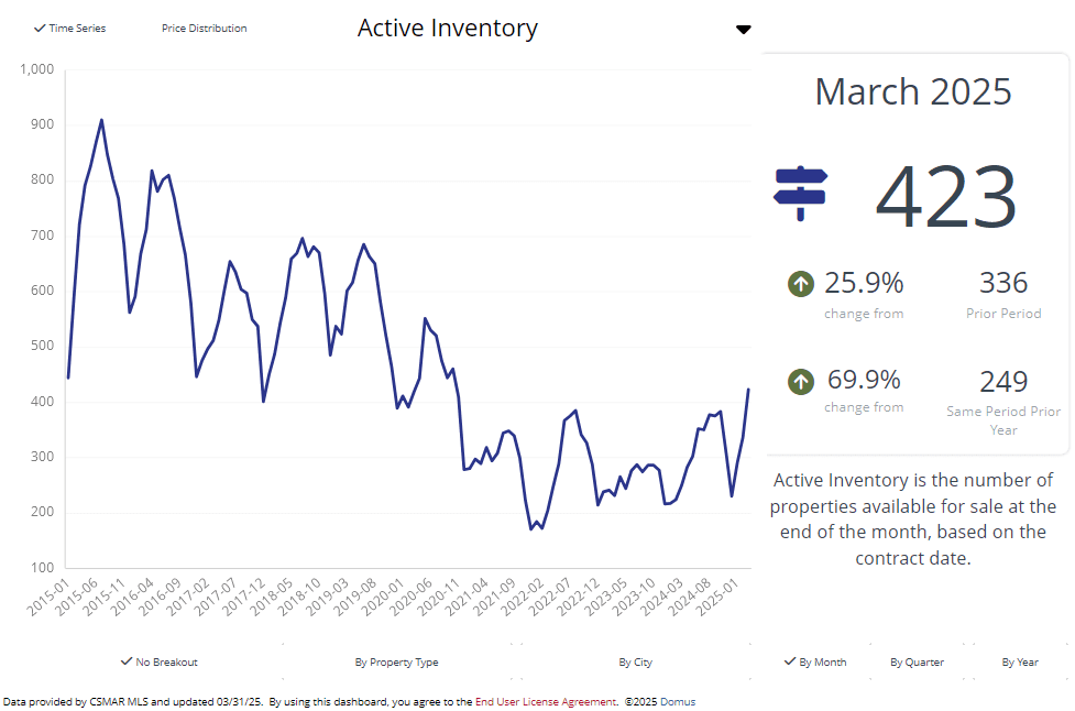 Inventory in Conejo Valley is rising significantly. At the end of March, we had 423 homes on the market—a 70% increase compared to last year. Although still below the historical norm of about 600-700 listings, inventory growth is happening at a time when buyer demand is lower, shifting the market in favor of buyers.