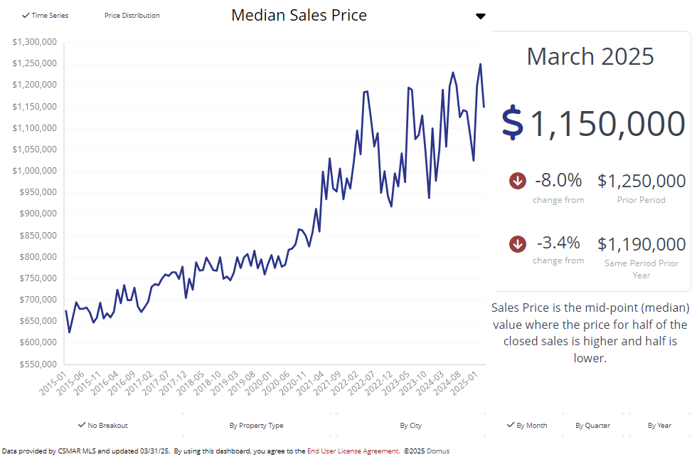 Prices in Conejo Valley have been fluctuating recently—jumping one month and dipping the next. But overall, they’ve settled into a range between $1.1M and $1.2M, with the median home price for March ending at $1,150,000.