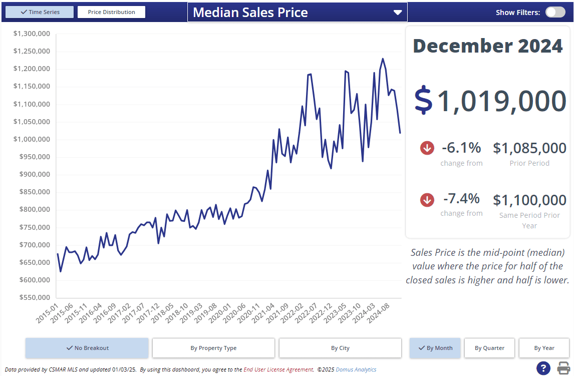 Home prices ended the year down 7.4% from last December to $1,019,000 in the Conejo Valley. But don’t read too much into that number; low volume of sales in December (120 sales) can throw off the numbers a bit.