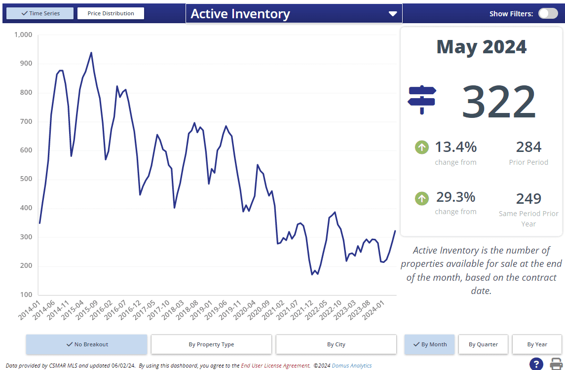 It appears that our low inventory has finally bottomed out. Last month ended with 30% more homes for sale (322) vs last year. Over the last week, 57 homes have come on the market and only 22 homes went into escrow meaning inventory is continuing to build.
