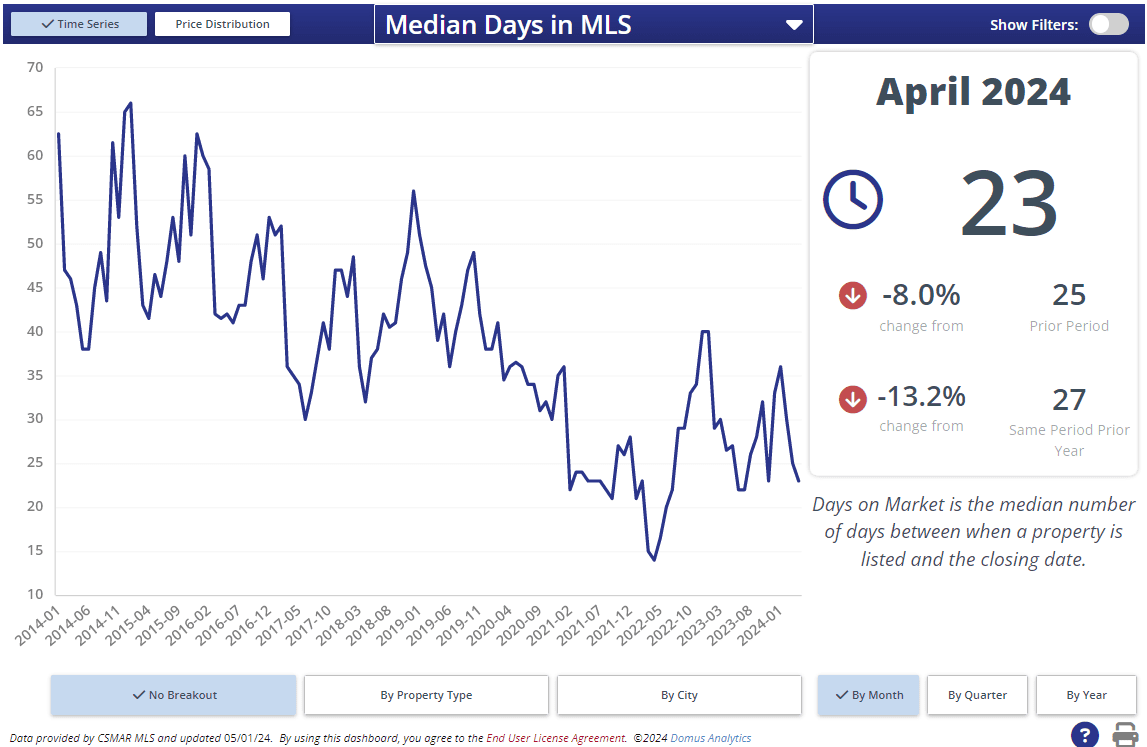 For the last year or so, home prices have been bouncing between $975k and $1.1 million. April ended with the median home price at $1,057,500. On average, homes are selling almost exactly at asking price, but remember, that’s the final asking price. Price reductions are becoming more common as competition picks up in many neighborhoods.