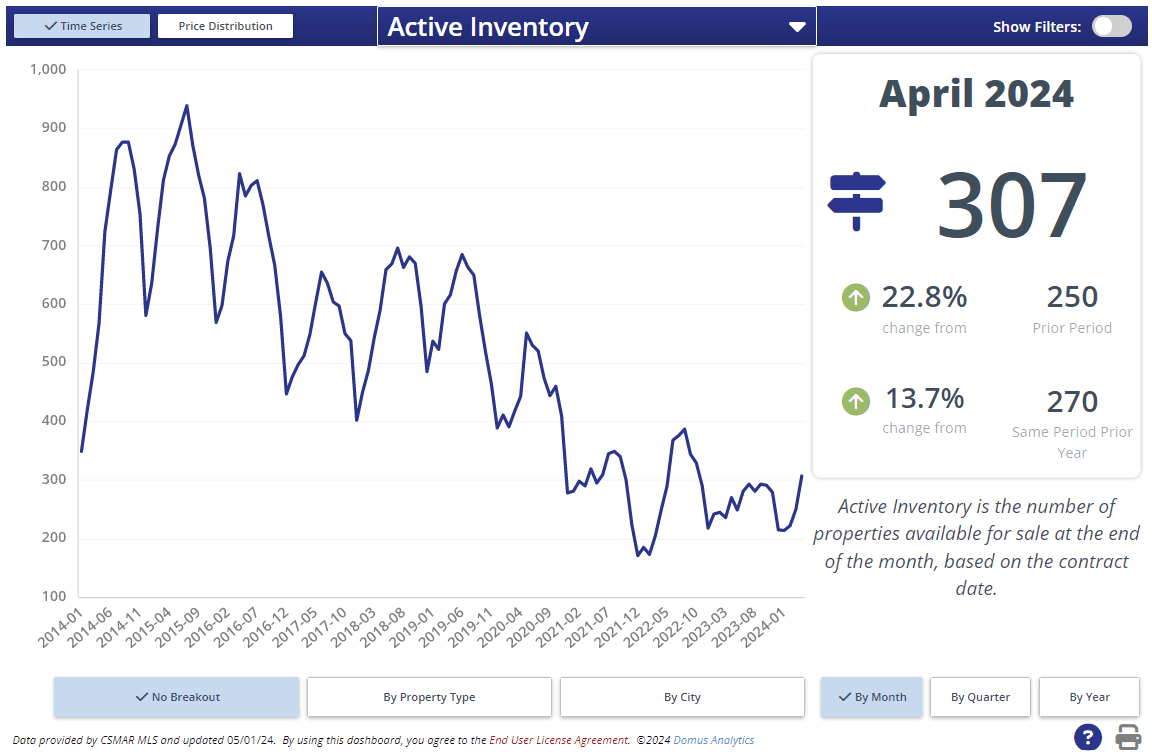Many homeowners put off selling as long as they could to keep their low interest rate, but that tide is slowly turning. April ended with 307 homes for sale which is still low, but a 13% increase over last year and a 23% increase over last month.