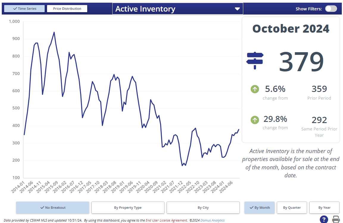 Conejo Valley homes are taking almost 50% longer to sell (39 days) compared to last year. And the inventory of available homes continues to grow – up about 30% to 379 homes for sale as many buyers opt to sit it out and wait till 2025.