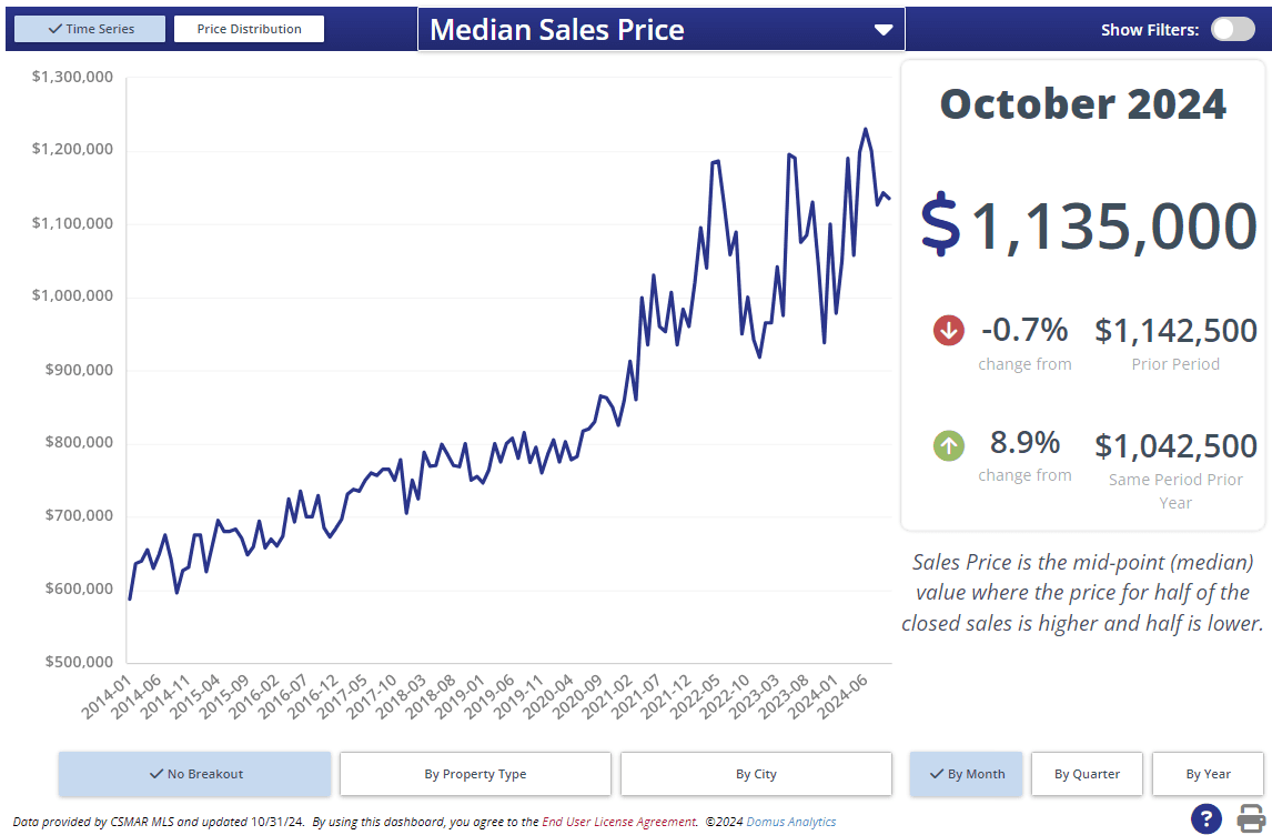 - The median price of a Conejo Valley home was up in October to $1,135,000.