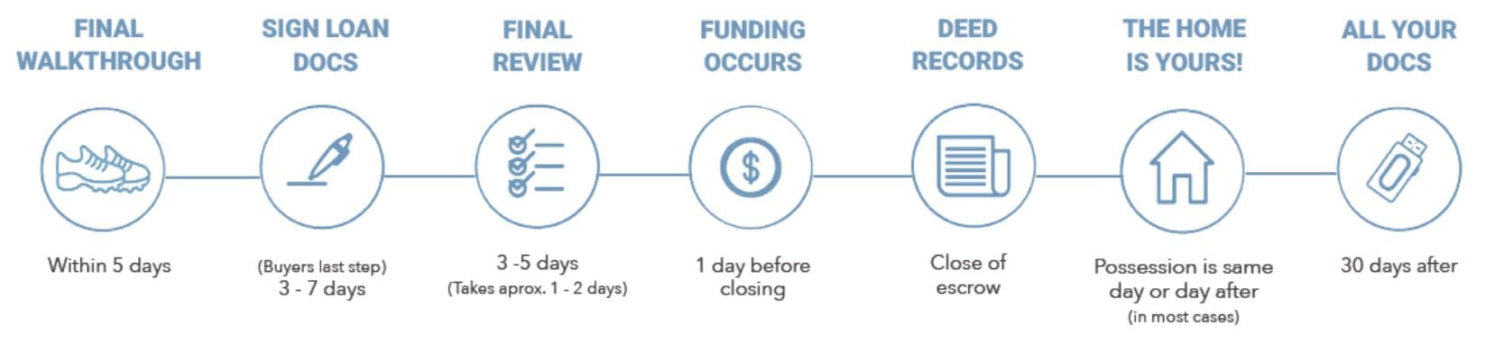 - See timeline above. Usually within a week before closing, loan docs will be sent from your lender to the escrow company. Escrow will schedule a time to meet with you to review and sign all the loan docs. This is your final step.