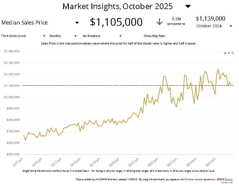 - Prices are down 3% from $1,139,000 last October.