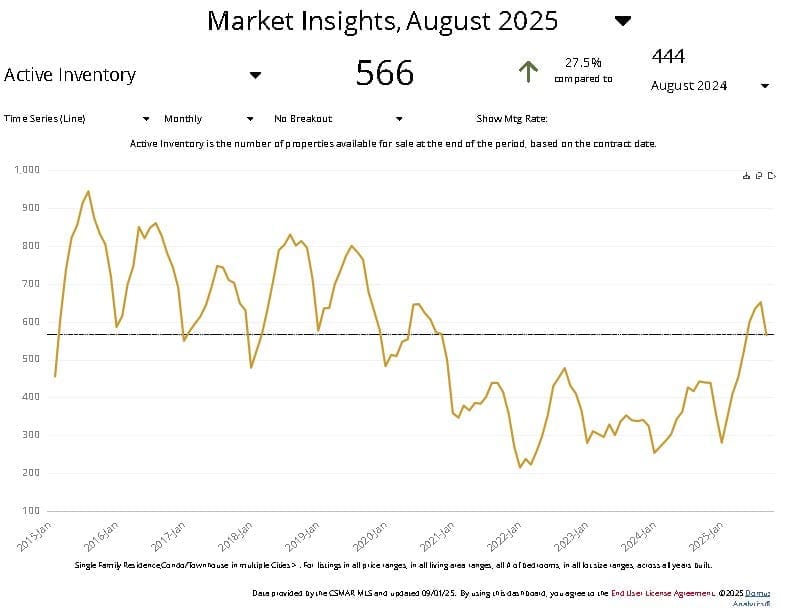 - 566 active listings, compared to 444 this time last year — a 27% increase
