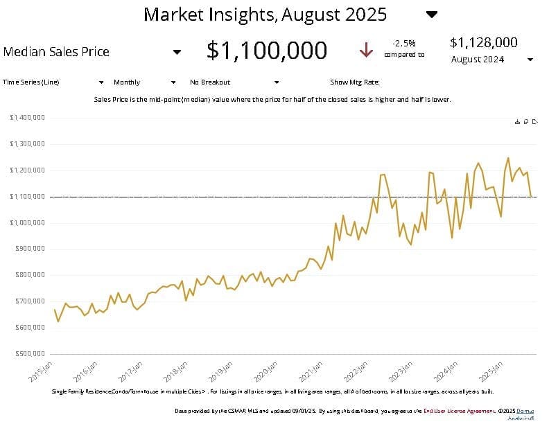 - Prices are down 2.5% from $1,128,000 last August.