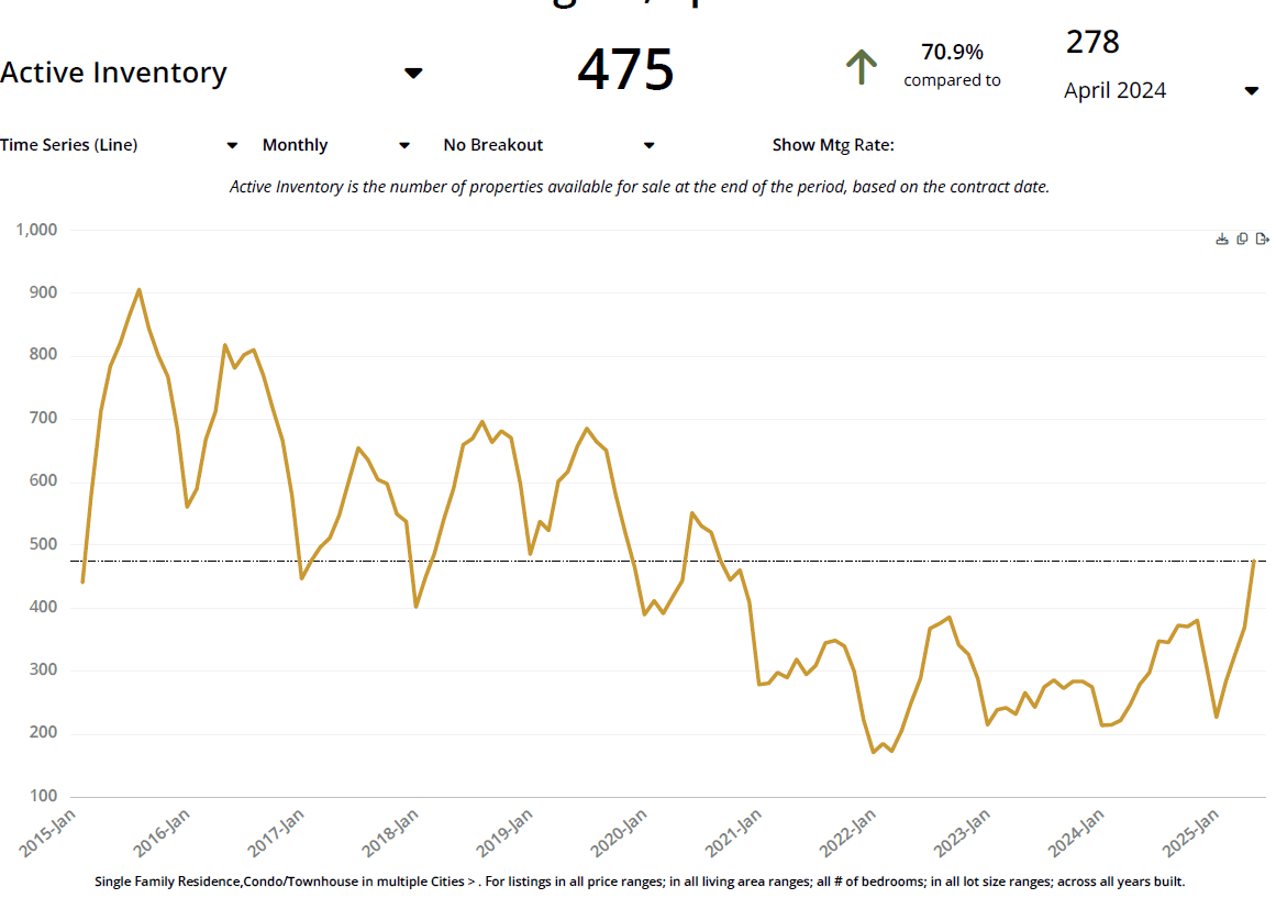 - 475 active listings, compared to 278 this time last year — a 70% increase